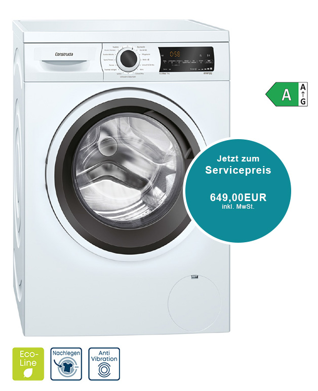 Großes, übersichtliches LED-Display für Programmablauf, Temperaturwahl, max. Schleuderdrehzahl, Restzeitanzeige und 24 h Endezeitvorwahl, Beladungsempfehlung und Verbrauchsanzeige - Trommelvolumen: 65 l - Nutzungszähler: Zählt abgeschlossene Programme - Trommelreinigung mit Erinnerungsfunktion - 32 cm-Tür, weiß-schwarzgrau mit 171° Türöffnungswinkel - Nachlegefunktion - BLDC-Motor - Anti Vibration Design - mehr Stabilität und Laufruhe - Geräuschdämmung durch Bodenplatte - Aqua Stop®: eine Constructa Garantie bei Wasserschäden - ein Geräteleben lang. - Drehwähler- Schaumerkennung - Unwuchtkontrolle - Kindersicherung - Signal am Programmende - Leichtreinigungsschublade