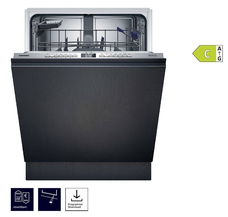 Energieeffizienzklasse: C • Energie / Wasser: 74 kWh / 9 Liter • Fassungsvermögen: 13 Maßgedecke • Programmdauer: 4:55 (h:min) • Geräusch: 42 dB(A) re 1 pW • Geräusch-Effizienzklasse: B