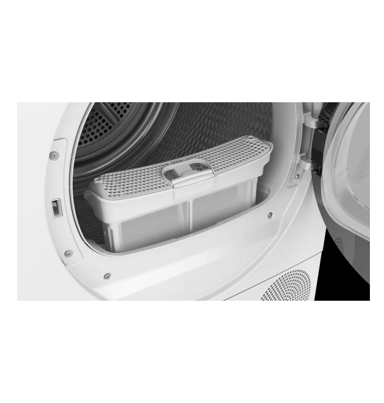 easyClean Filter • softDry-Trommelsystem: große Edelstahltrommel, Mitnehmer im Softdesign • Trommelinnenbeleuchtung: LED • anti-vibration Design: mehr Stabilität und Laufruhe • Drehwähler • Großes, übersichtliches LED-Display für Restzeitanzeige und 24 h Endezeitvorwahl, Programmstatus, Zusatzfunktionen. • AutoDry: feuchtegesteuerte Trocknungsprogramme • Beladungsempfehlung • Nutzungszähler: Zählt abgeschlossene Programme • Tür Alu-Look, weiß • Seitlich öffnende Drehtür, Anschlag rechts • Metallverschlusshaken • Kindersicherung • Signal am Programmende • Komfort-Ablaufgarnitur